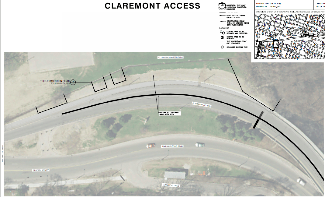 - The upbound lanes of the Claremont Access will be resurfaced. As part of the project the vehicular portion will be reduced to 2 lanes to allow for the provision of a multi-use trail which will be separated and protected from vehicles by a new concrete barrier.