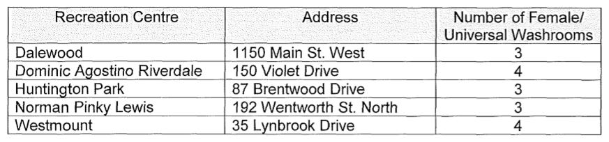 Staff estimate that it will cost $30,000 to provide menstrual products in women’s and universal washrooms in the following five City recreation centres for the duration of the 12 month pilot program: